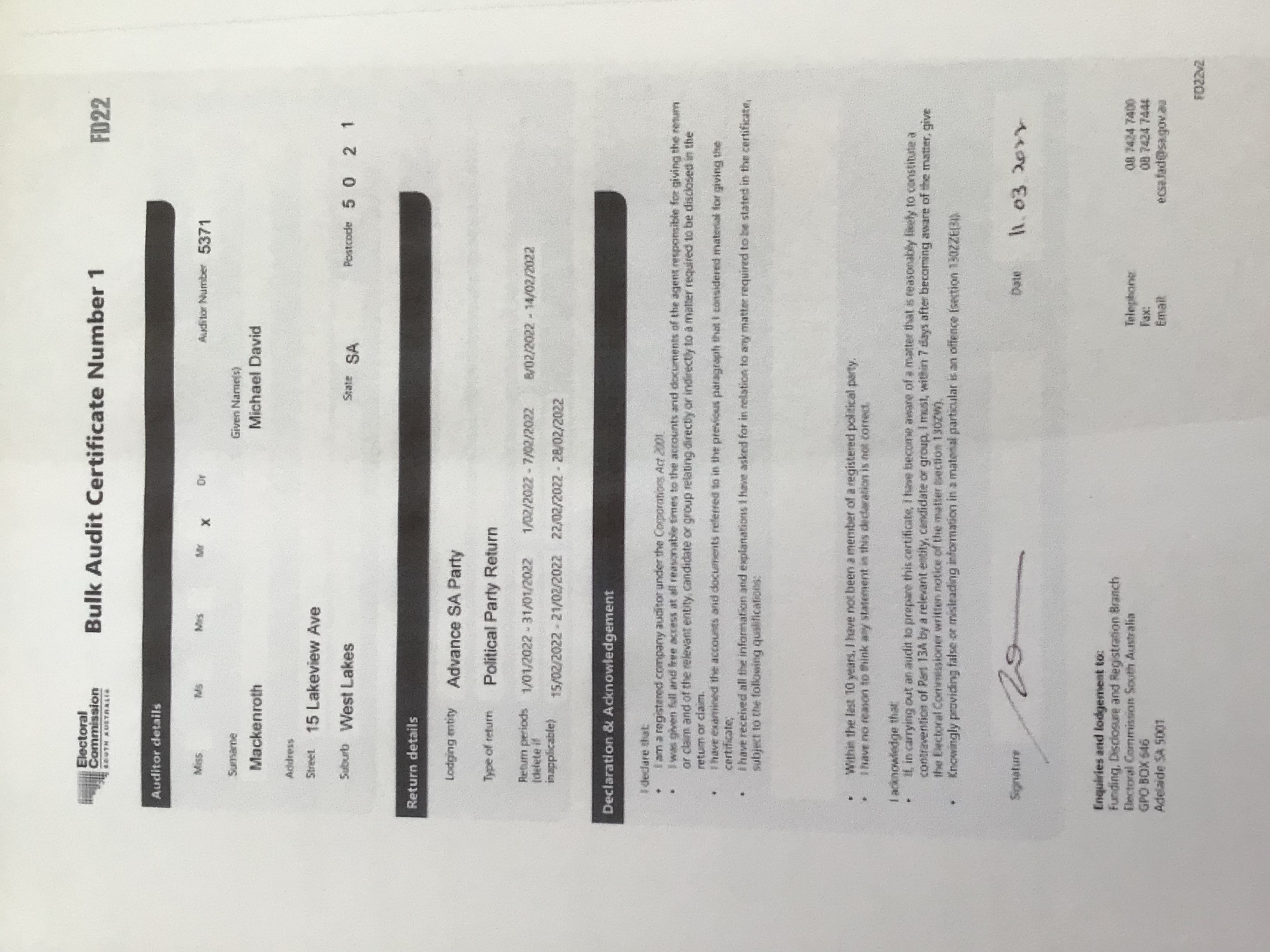 Registered political party detailsPolitical partyAdvance SAAgent full nameMathilda Darley