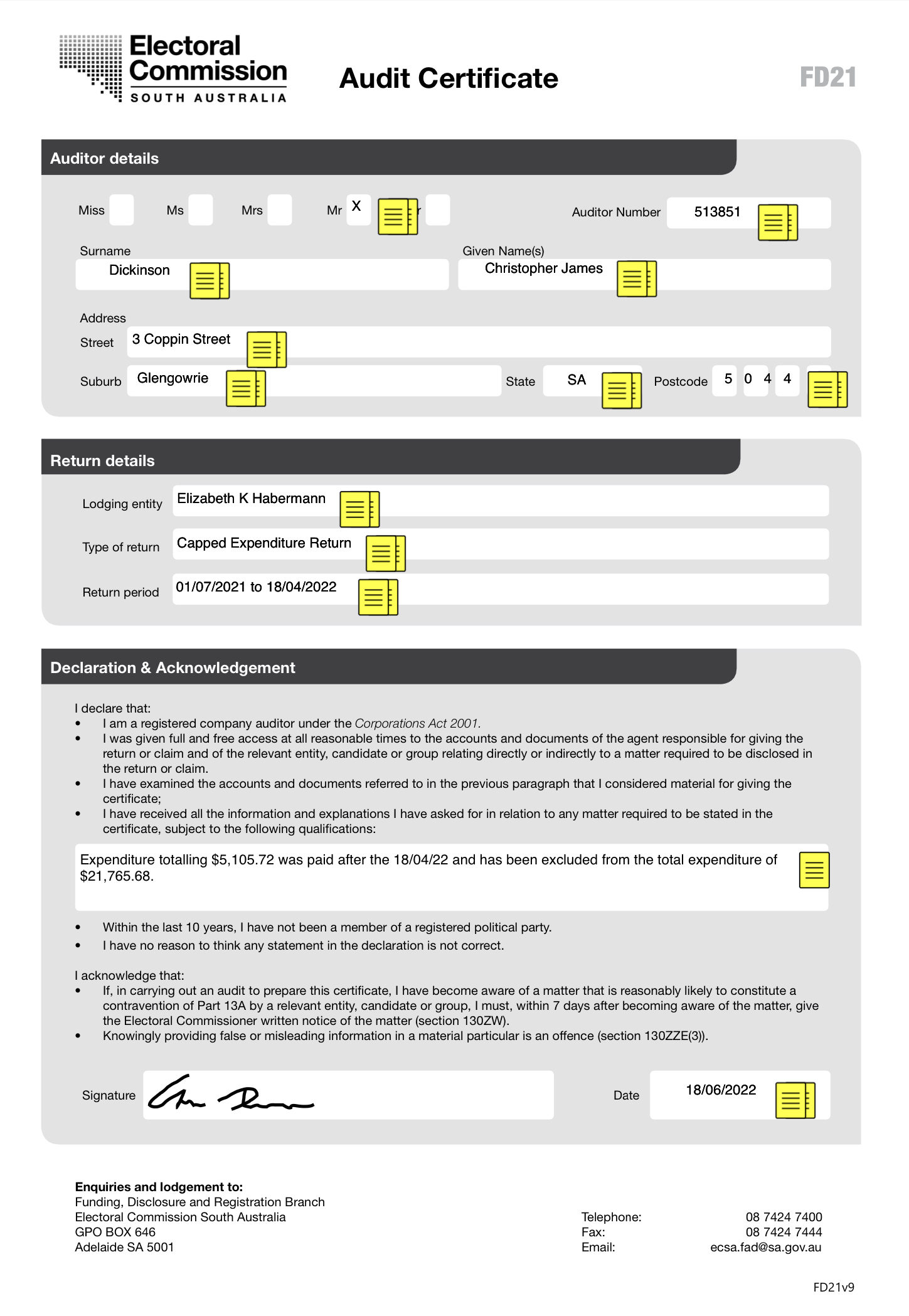 ExpenditureApplicable Expenditure Cap$100,000Political Expenditure Incurred During the Capped Expenditure Period$21,765Political Expenditure Incurred Before the Capped Expenditure Period for Use During the Period$0Total Expenditure$21,765