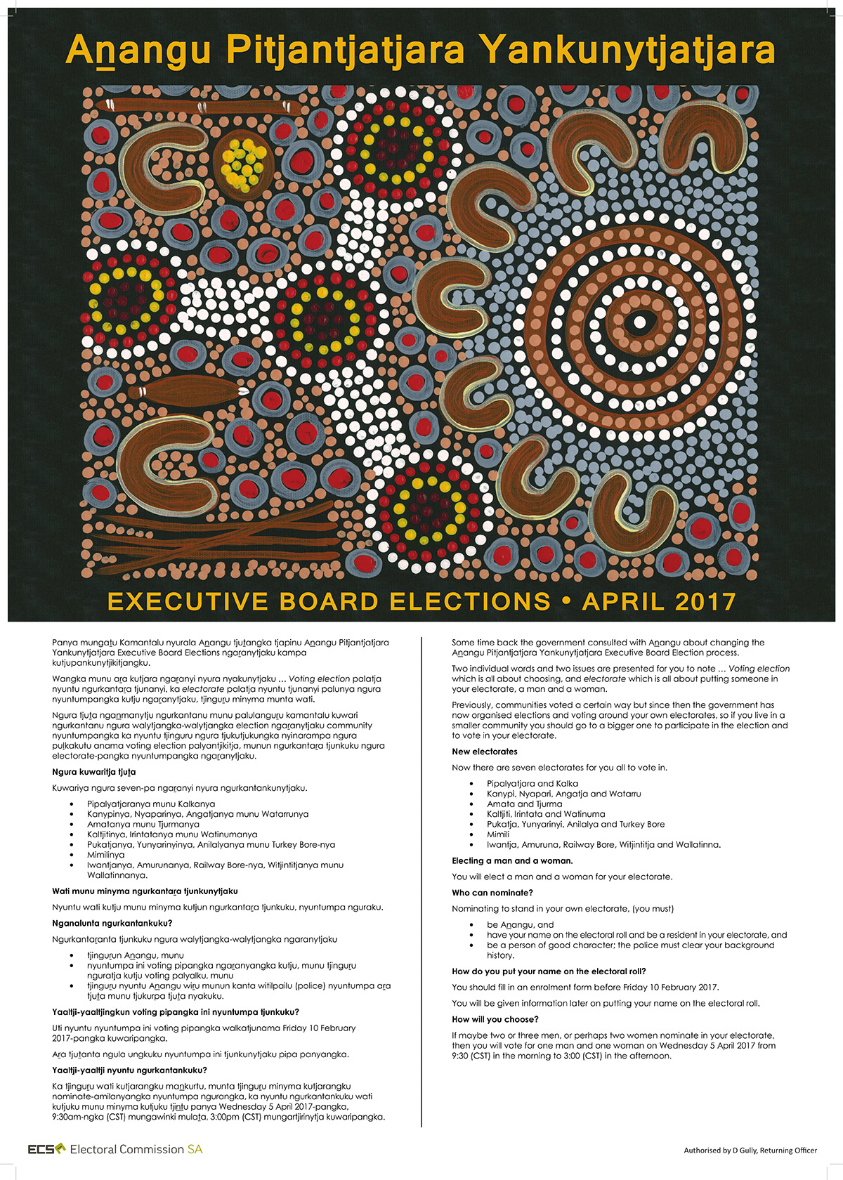 Figure 2: APY election posterVoting for the APY Executive Board election was conducted between 9:30am and 3:00pm on Wednesday 5 April 2017.