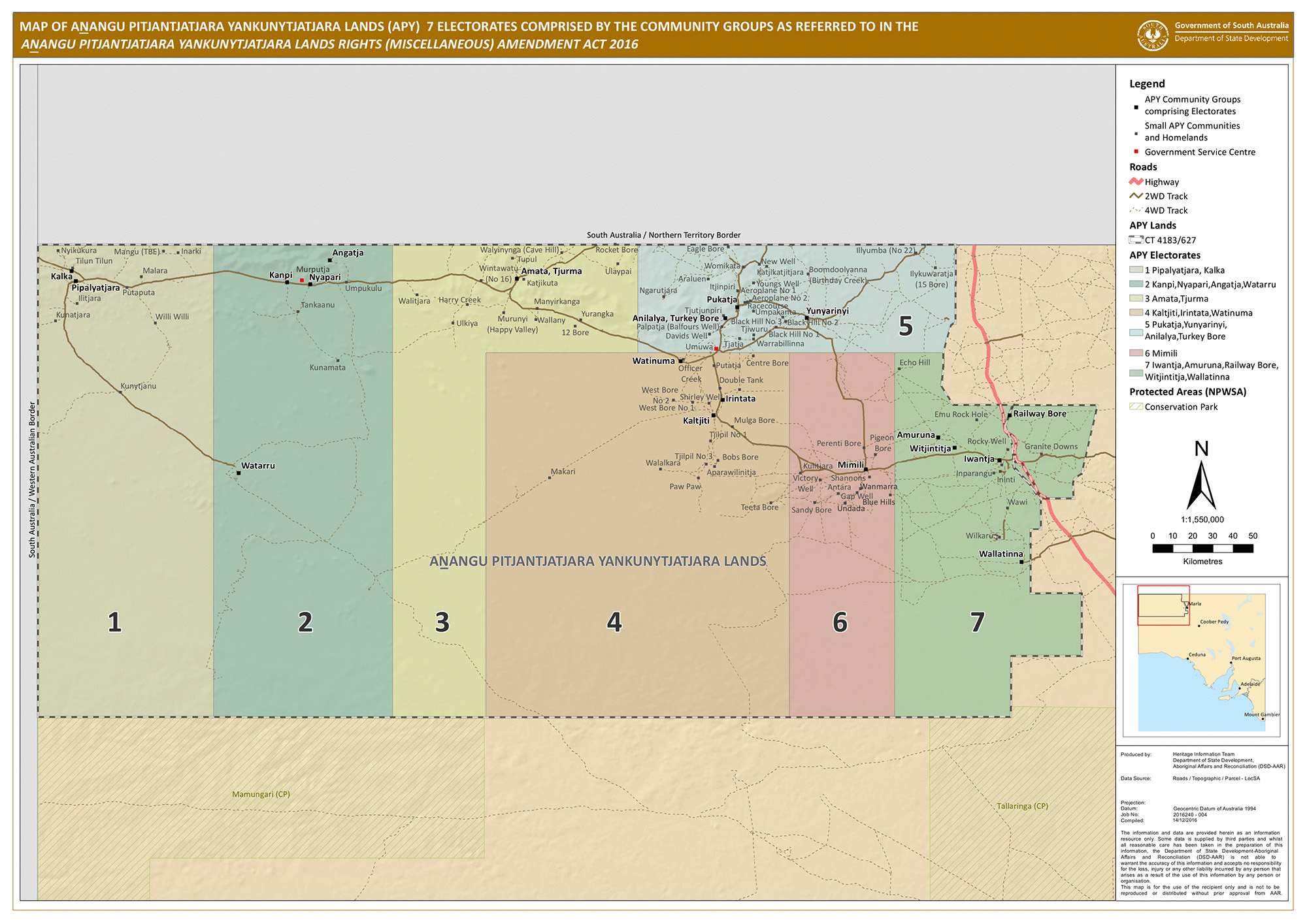 The Anangu Pitjantjatjara Yankunytjatjara Land Rights (Miscellaneous) Amendment Act 2016 resulted in significant legislative amendments being introduced for the conduct of elections for the Anangu Pitjantjatjara Yankunytjatjara (APY) Executive Board. The legislative changes support gender balance representation on the APY Board with each electorate requiring a male and a female representative to be elected. Eligibility to stand for election to the Executive Board and to vote in the elections require enrolment on the State electoral roll. Further eligibility requirements for prospective candidates now require the introduction of criminal history checks as a test of suitability to serve on the Executive Board.